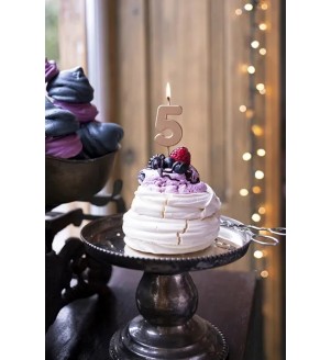 Sünnipäevaküünal number 5 roosakuldne , kõrgus u. 4,5 cm .
