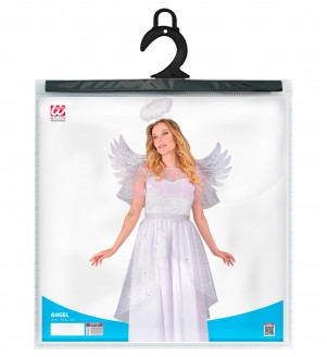 В состав костюма входит : платье ,ободок нимб ,крылья .